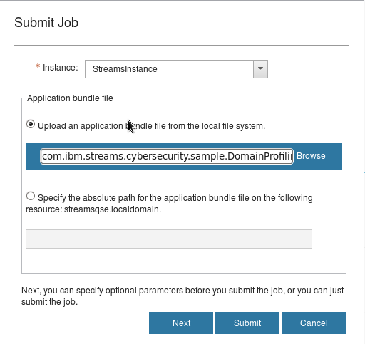 . Select the *.sab file found in the ‘output/’ directory in the sample application. For example, for the DomainProfilingSample application, you would select this file: /path/to/DomainProfilingSample/output/DomainProfilingBasic_Output/com.ibm.streams.cybersecurity.sample.DomainProfilingBasic.sab -