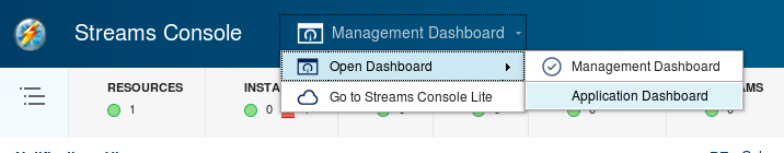 At the top of the Streams Console, switch to the Application Dashboard, which allows you submit, cancel and monitor applications.
